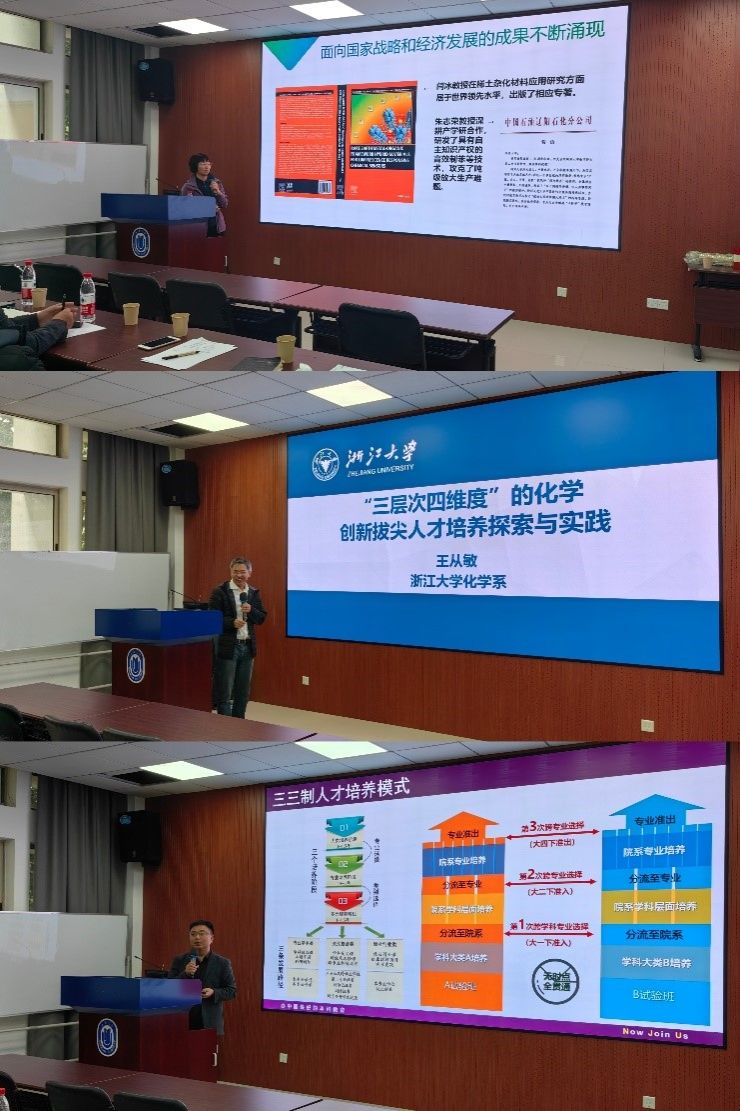 南京大学俞寿云教授做了“南京大学化学拔尖人才培养体系的构建与实施”的报告,提出构建“三元四维”人才培养新体系,推动从一流本科教学改革向一流本科教育建设,从人才培养模式创新向人才培养体系创新发展。浙江大学王从敏教授做了“三层次四维度的化学创新拔尖人才培养探索与实践”专题报告,突出培养基础研究拔尖人才的目标导向,建立导师制、小班化、模块化、国际化的本科生一流培养机制, 推进多维度评价模式。刘梅川教授以“创新驱动,交叉引领”为导向,介绍了同济大学化学科学与工程学院近几年拔尖人才培养经验和典型案例。