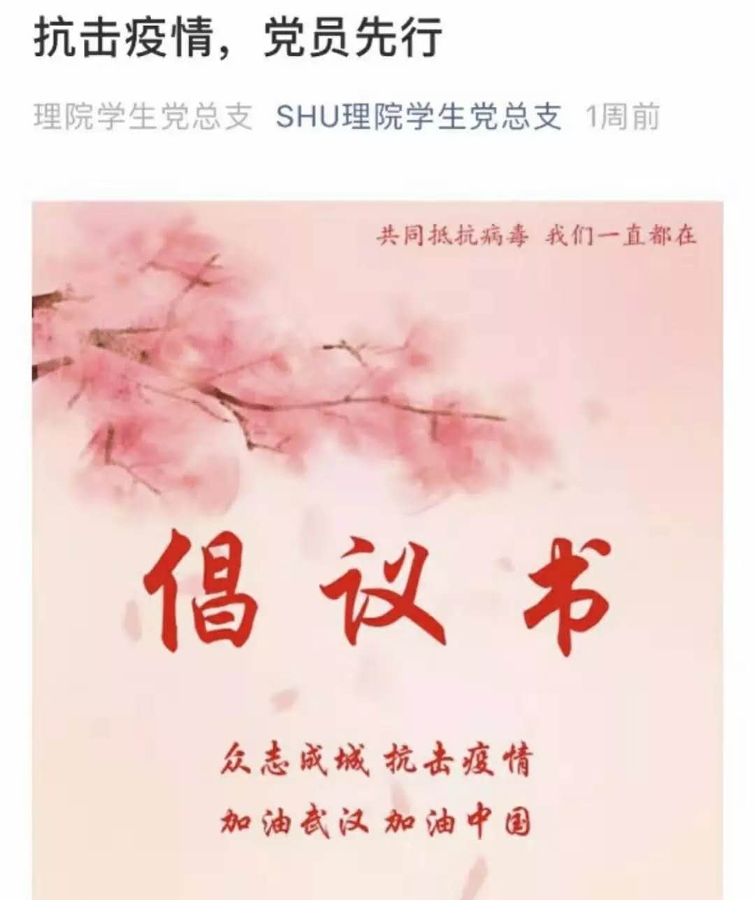 2月3日,教育部发出致全国大学生的一封信,信中写道:每一位同学都牵系一个家庭,每一个青年应担当一份使命,自觉做科学的传播者、谣言的粉碎者、健康的守护者、家庭的关爱者。”在新型冠状病毒防控工作中,身处在全国各地的党员们也即刻行动,他们或服务师生、或志愿服务、或爱心奉献,让初心使命在这场战疫中闪闪发光。程洁等5名党员自愿缴纳特殊党费,为打赢本次战疫贡献自己的力量。我院俱李菲、钟玉义等10名研究生党员参与本地区隔离防护、道口查控以及上门巡查等防控相关工作,彰显新葡的京官网研究生的担当。吴中梅、王晶洁等35名学生干部,协助上大校友顾黎星,依托上大秦甲中心,参与救援物资对接物资,现已辐射湖北、湖南、江西等多地医院、红十字会。虽然有些同学不能投入抗疫战争,但范文斌等同学他们以笔为枪,与全国各地音乐人在线协作,用旋律书写抗击疫情的赞歌,引导广大青年弘扬正能量,在这场全民战争中紧随党的步伐,增强大学生的使命担当,凝聚力量,共克时艰。