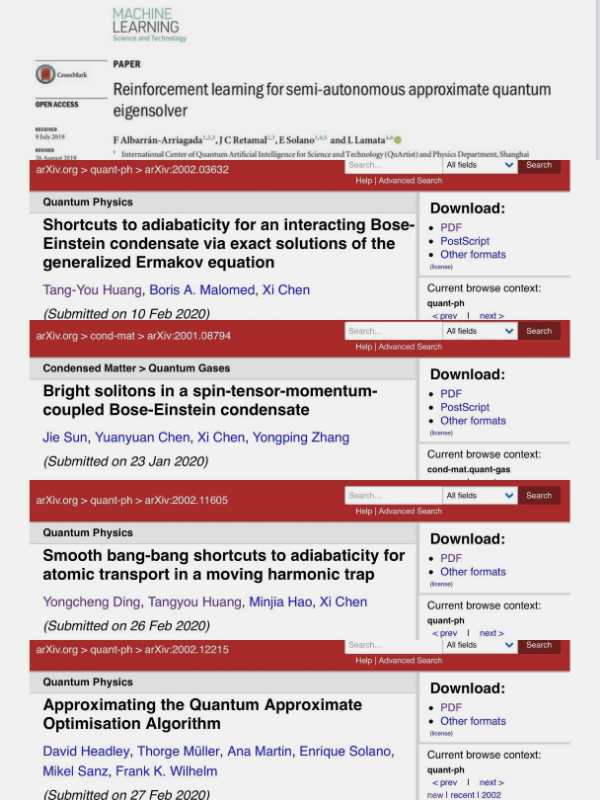 为了确保中心中外学生充分利用居家时间高效率做好科研,中心研究生导师们要求每位学生制定了更详细的研究计划,确定了研究任务,并通过各专业微信群、视频会议等形式跟进学生们的科研进度。中心随处可见的小组研讨变成了线上研讨。中心主任Solano教授与欧洲IQM量子公司正在商讨全面合作事宜。疫情期间,中心还完成了与华为量子合作的相关协议,推进新葡的京集团8814登录入口与知名企业的合作。与此同时,中心的科研成果层出不穷。Albarran博士在最新IOP推出的期刊《Machine Learning》杂志上发表了利用增强机器学习求解量子本征态的相关成果。张永平教授和陈玺教授完成了张量自旋轨道耦合BEC的孤子特性研究。陈玺教授研究了原子冷却和转移的量子绝热捷径最优化方案,相关成果已经发表在arXiv预印本上,就得到了知名物理学家Roberto Onofrio的关注。目前中心的这些论文均已投稿至Physical Review Letters, Physical Review A和Chaos等杂志。