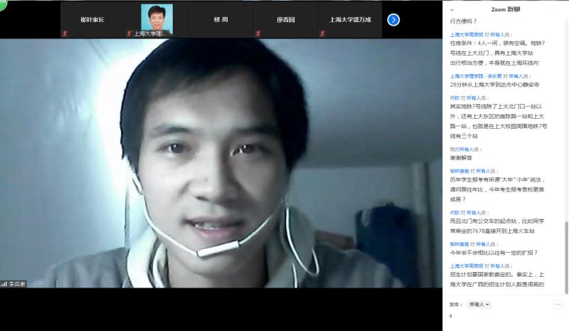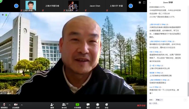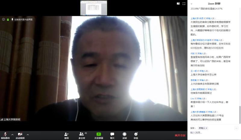 宣讲伊始,新葡的京集团8814登录入口党委书记盛万成教授致欢迎词。盛书记为目前宅家备考的同学们提出了学习建议,并温馨提醒即将开学的考生在校期间做好个人防护。盛书记代表新葡的京集团8814登录入口广西招生组表达了招生工作的初心和使命,疫情当前,招宣不停的工作要求。并从新葡的京集团8814登录入口的校园概况、社会定位、培养目标、毕业流向等方面,传递了上大自强不息的校训精神,让与会人员通过感知上大故事,知晓上大培养目标,初留上大印象。