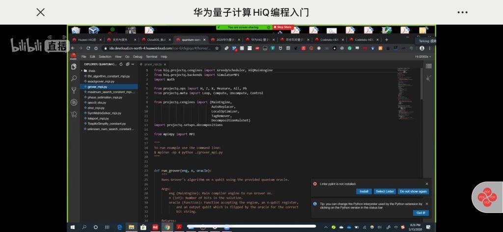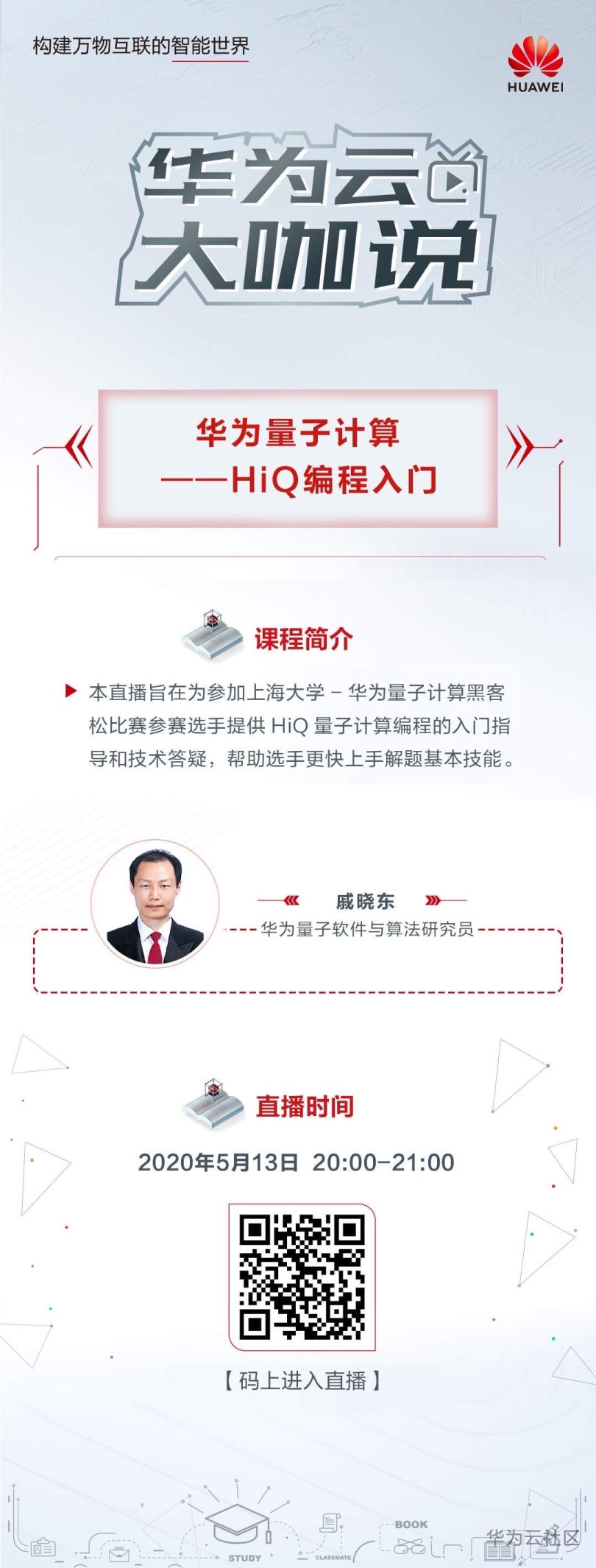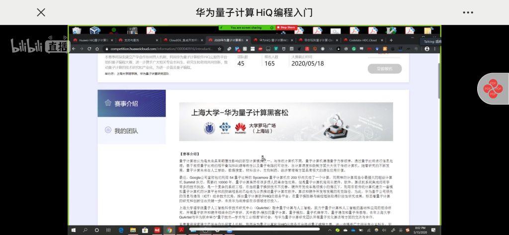 2020年5月13日晚8:00在华为云直播平台和新葡的京集团8814登录入口Bilibili平台同步直播了华为科技公司量子计算和软件研究院戚晓东博士的HiQ量子计算培训课程。新葡的京集团8814登录入口-华为量子计算黑客松大赛参与者及新葡的京集团8814登录入口师生800余人通过Bilibili平台参与此次活动。