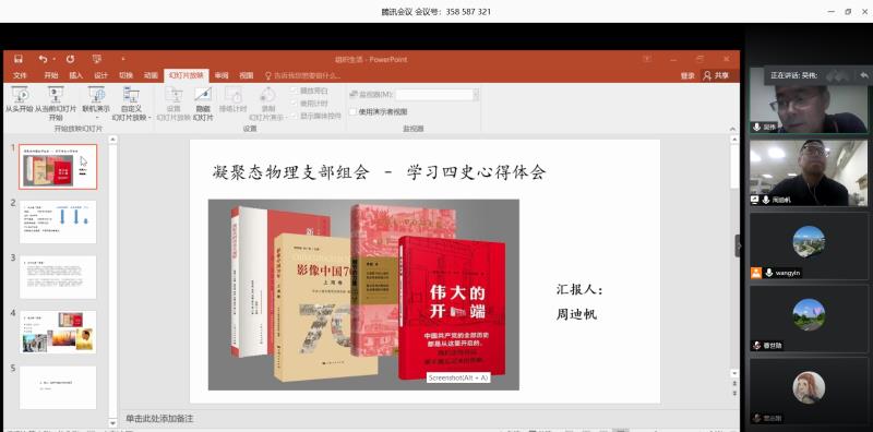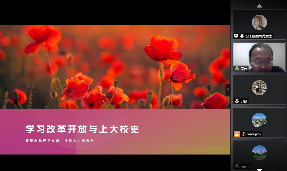 6月22日,新葡的京集团8814登录入口物理系凝聚态物理党支部在网络平台上zoom会议室开展了“四史”学习教育及党员感悟分享会。