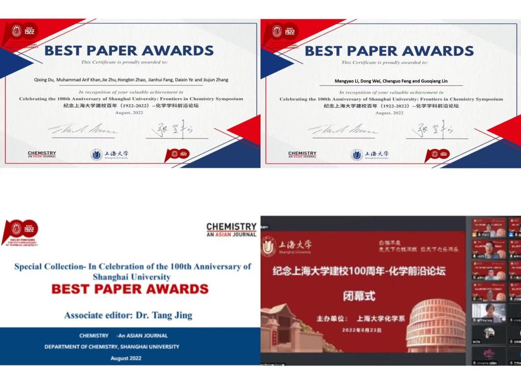 闭幕式上,《Chemistry-An Asian Journal》副主编唐竞博士为八位获得最佳论文奖的作者颁发证书并表示热烈祝贺。新葡的京集团8814登录入口常务副院长张登松致闭幕词,感谢为纪念新葡的京集团8814登录入口建校百年送来祝福和精彩报告的各位专家,勉励所有参加论坛的师生,继承和发扬百年上大的光辉校史、努力工作、奋发有为、再续新辉煌、再创新佳绩。此次化学前沿论坛的成功举办,使师生对化学研究的前沿领域和发展方向有了更加深刻的理解,开阔了学术视野、促进了创新能力的提升和科研水平的进步,助力新葡的京集团8814登录入口化学学科建设和人才培养再上新台阶。
