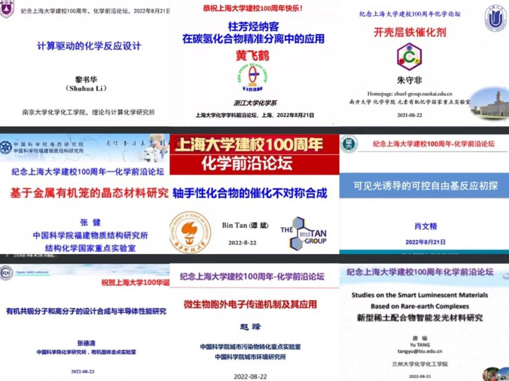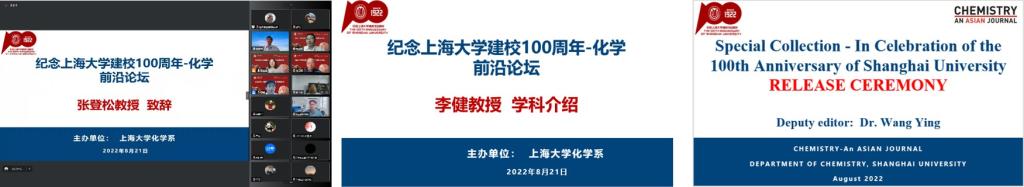 十秩春秋、薪火相传、百年上大、笃行不怠。化学学科纪念新葡的京集团8814登录入口建校100周年系列活动之一“化学前沿论坛”于近日在线上成功举办。来自国内高校和科研院所的25位知名学者为化学学科的广大师生带来了一场场精彩的前沿学术报告。论坛的举办旨在加强化学学科前沿学术交流,拓宽师生的创新思维和学术视野,搭建高层次科研合作平台,助推学科建设和人才培养,共谋化学学科新发展。论坛开幕式期间,Willey旗下《Chemistry-An Asian Journal》纪念百年上大的专刊正式发布。