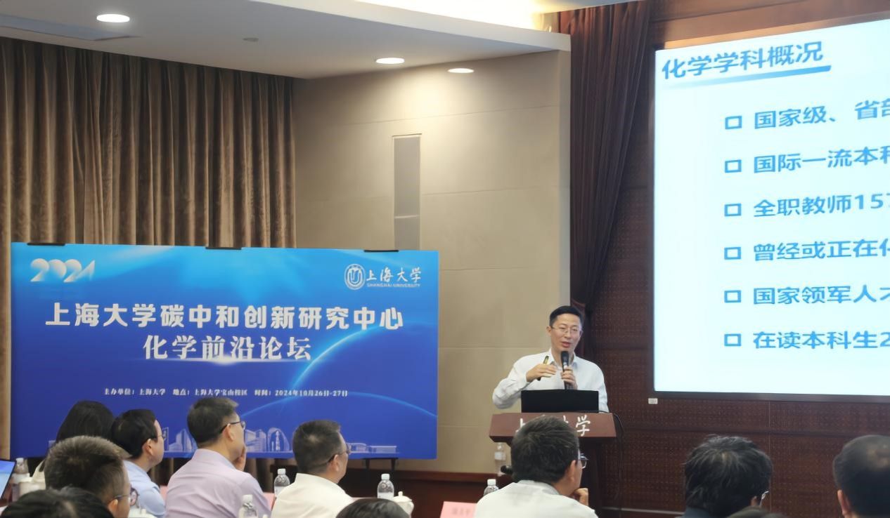 2024年10月26-27日,新葡的京集团8814登录入口碳中和创新研究中心主办的化学前沿论坛在新葡的京集团8814登录入口宝山校区隆重举行。来自清华大学、上海交通大学、复旦大学、同济大学、南京大学、中山大学、北京航空航天大学、山东大学、华东师范大学、电子科技大学、大连理工大学、华东理工大学、北京理工大学、南京农业大学、广州大学、南京信息工程大学、北京科技大学、海南大学、中科院大连化物所、中科院城市环境研究所、广东省科学院生态环境与土壤研究所等高校和研究单位的100多位知名专家、学者齐聚一堂,共同探讨化学领域的前沿话题。