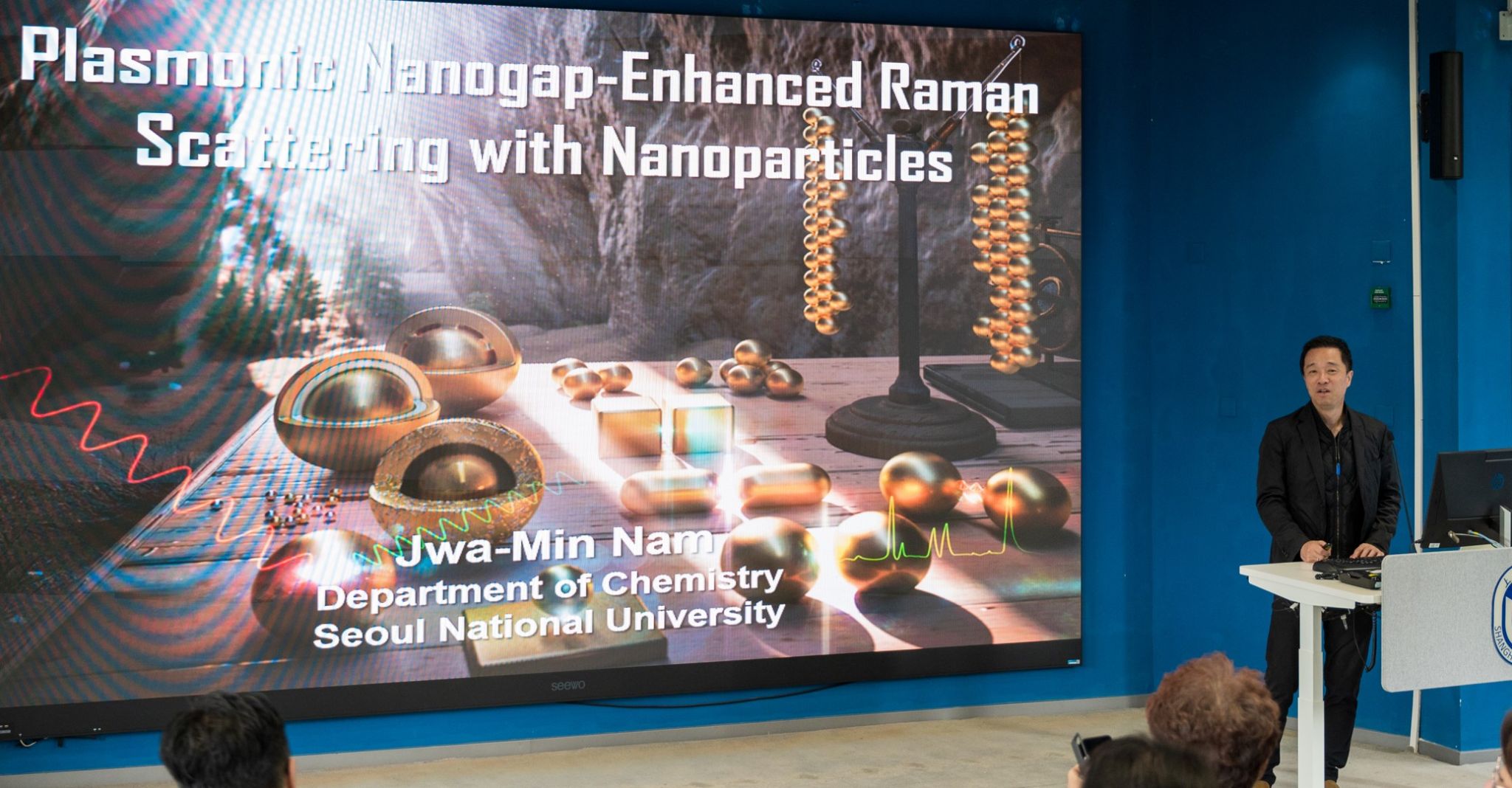 Jwa-Min Nam教授为新葡的京官网师生作了题为“Chemical Plasmonics of Metal Nanoparticles”的精彩学术报告。Jwa-Min Nam教授主要介绍了其在表面等离子体光子学研究方面的进展。表面等离子体光子学是在小于光波长的尺度上(例如金属纳米颗粒)研究和控制光与物质之间的相互作用。化学纳米表面等离子体光子学主要研究和利用纳米尺度化学手段来推动表面等离子体光子学的发展,以及利用表面等离子体光子学解决化学及其他相关领域中的关键问题和挑战。设计合成可控的金属纳米结构是表面等离子体光子学在化学、材料科学、光学、纳米科学、生物技术和医学中能够广泛应用的关键。Jwa-Min Nam教授分享了其在分子可调和结构可重复表面等离子体光子学纳米结构的设计、合成和表征等方面的成果,包括具有强、可控和可定量表面等离子体光子学信号的金属纳米间隙结构、多组分金属纳米颗粒和金纳米链(如定量表面增强拉曼散射)等。随后,Jwa-Min Nam教授展示了上述结构在应对表面等离子体光子学、生物传感、生物成像和治疗方面的一些重要挑战中的潜力,并讨论了这些新型表面等离子体光子学材料在纳米化学、下一代疾病诊断、分子计算和纳米机器人等领域的引领性作用。