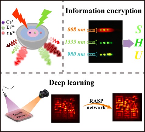 稀土掺杂纳米晶体因具有高的光化学稳定性、长发光寿命(μs-ms)、窄的发射带、以及低毒性等优点,被认为是最有前途的发光材料之一。纳米晶体在掺杂了具有丰富能级的稀土离子后能够产生多种波长发射,然而控制稀土离子的多模式发射仍然是一个巨大的挑战。新葡的京集团8814登录入口孙丽宁教授团队通过多年稀土发光领域的研究经验和积累,提出通过控制能量迁移路径以实现可调制的上转换/下转移多模发射概念。经过不断努力,该团队设计制备了一系列在不同光波长激发下,产生可调的上转换发光和下转移发光的Er3+基核-壳结构纳米晶体。这些具有独特光学特性的纳米晶不仅可以应用在信息安全领域,而且与深度学习相结合,能轻松实现猪肉组织中可见光信息的存储及解码。该工作不仅为调控稀土发光提出了新的研究方案,而且为开发用于尖端应用的智能发光材料带来了崭新的研究思路。