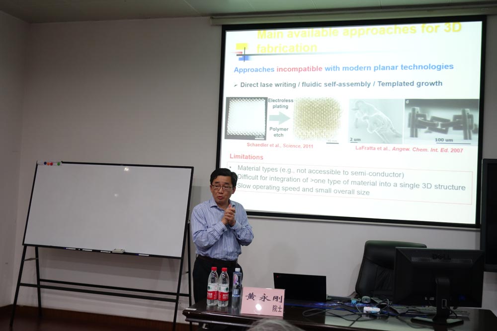 此外,黄永刚院士还做了题为"Mechanics-guided Deterministic 3D Assembly"的学术报告,深入介绍了他领导的研究组开创的基于力学设计构筑三维器件的新方法。该方法突破了3D打印技术对于材料具有选择性的局限,是力学与结构设计交叉融合的典范。报告后师生们与黄院士就该方法的基本思想、关键技术以及潜在应用开展了深入讨论。