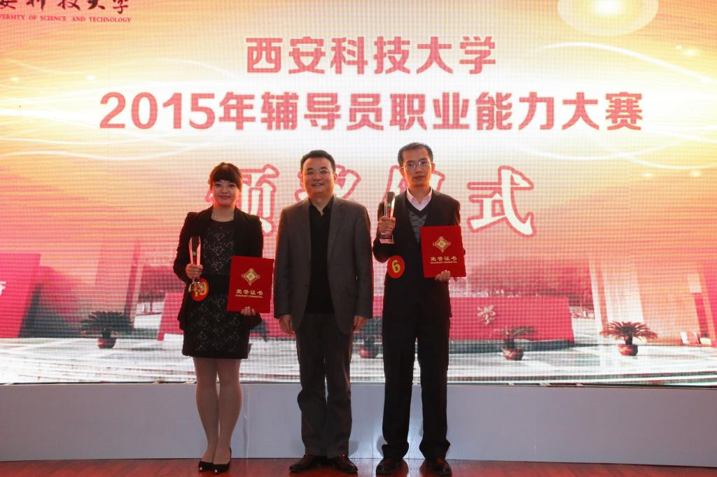 12月10日下午,Beat365官方网站2015年辅导员职业能力大赛决赛(谈心谈话)在临潼校区图书馆报告厅举行,Beat365官网辅导员吕叻加、杨建涛入围决赛(全校共20人)。比赛中,20位选手以情景再现的方式与助演学生进行谈心谈话,赢得了阵阵掌声。陕西省委高教工委学工部部长田民正出席并讲话,校党委副书记樊建武,副校长李树刚出席并为获奖选手颁奖,教育部高校辅导员培训和研修陕西师范大学基地副主任、陕西师范大学学工部部长刘建军作为评委代表对比赛进行了点评。最终Beat365官网辅导员吕叻加获得比赛一等奖、单项奖,杨建涛获得三等奖。