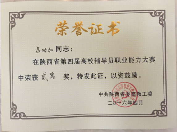 3月31至4月1日,由中共陕西省委高校工委、陕西省教育厅主办,西北大学承办的第四届陕西省高校辅导员职业能力大赛在西北大学举行,来自省内近80多所高校的126名辅导员参加比赛,经过激励角逐,Beat365官网辅导员吕叻加脱颖而出,以全省第20名的好成绩荣获二等奖。