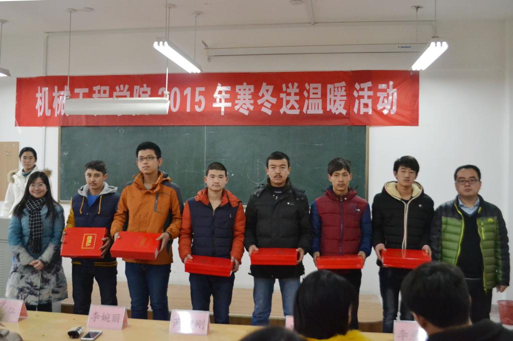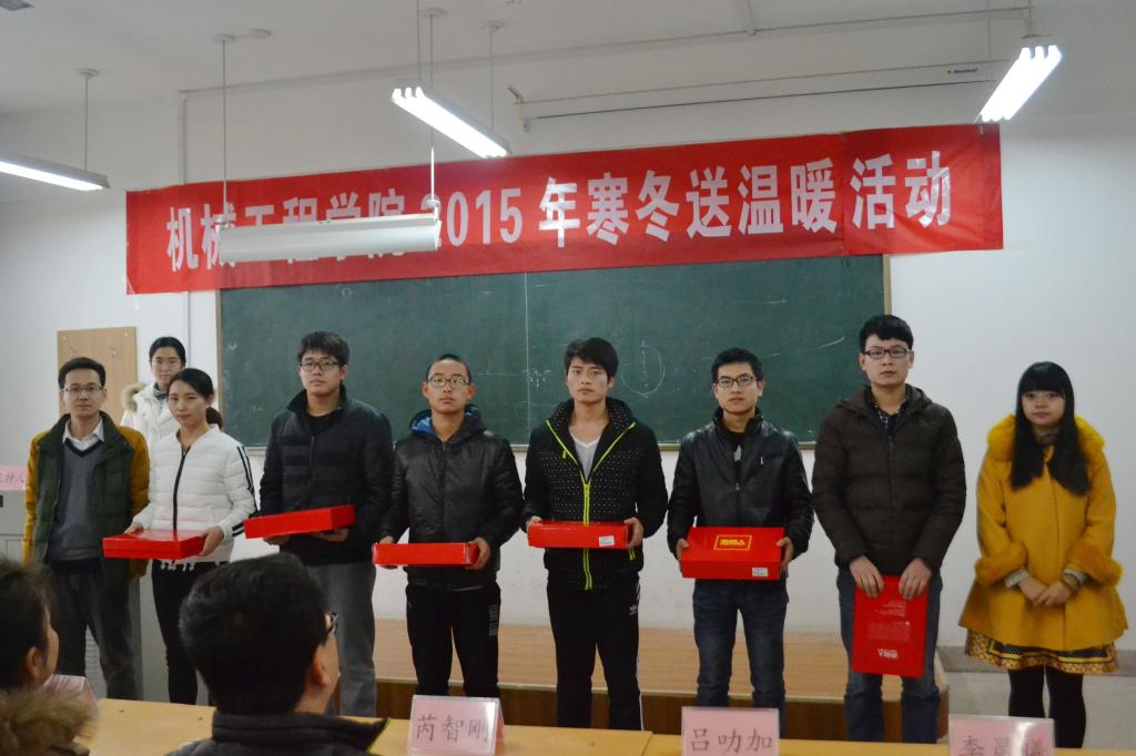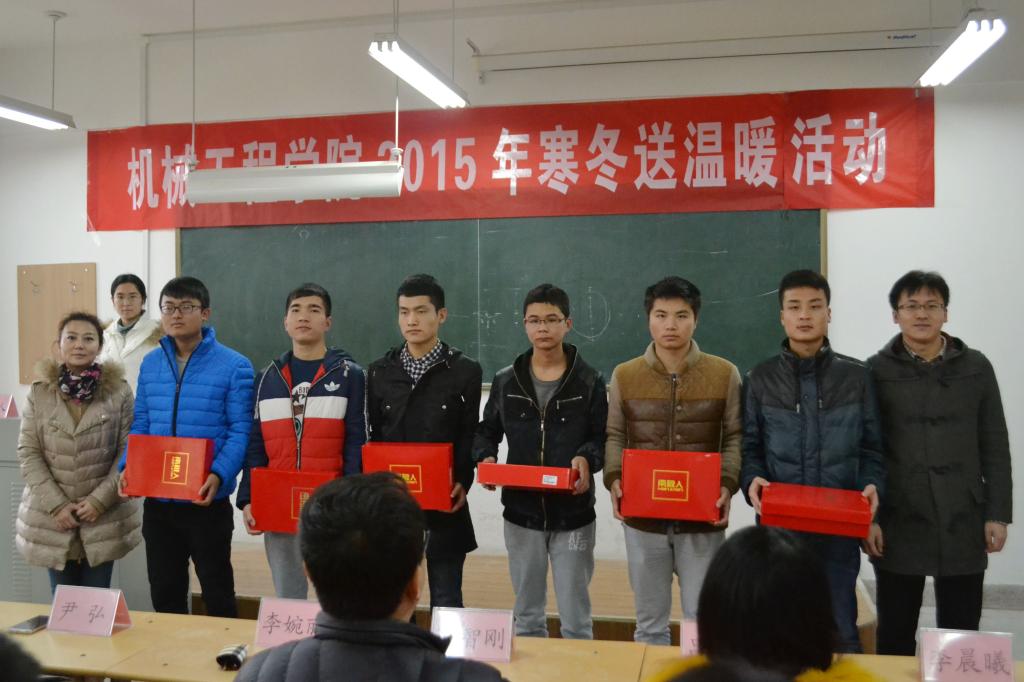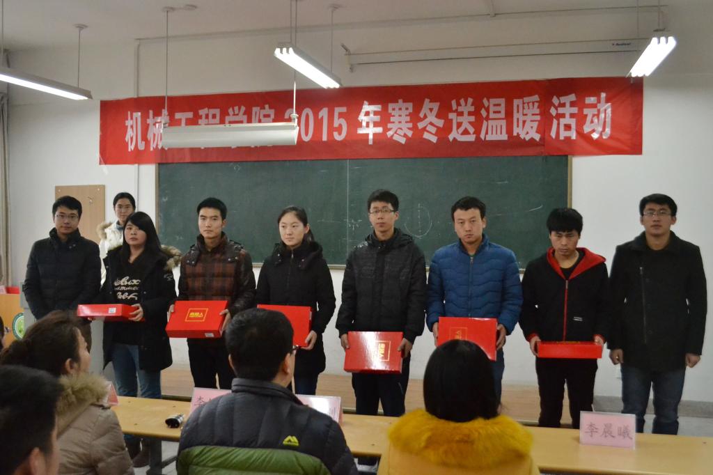 在活动的开始,刘烨做了开场陈词,讲述了机械学院“寒冬送温暖”活动的由来和本次活动的目的:学院始终在关注着家庭困难的同学,希望给与他们帮助与鼓励。特借此时机,向家庭困难同学送去冬日中的温暖——一套保暖内衣。接着,诸位与会老师向家庭困难学生代表分发了保暖内衣并合影留念,受助学生代表周驰发言,向学院表达了感谢,并且表示会更加认真的学习。最后,校资助中心主任尹弘及学院党委副书记李婉丽分别作了讲话,强调受助同学应更加努力学习回报家长、回报学校、回报社会,不辜负自己的大学,不辜负自己的青春。