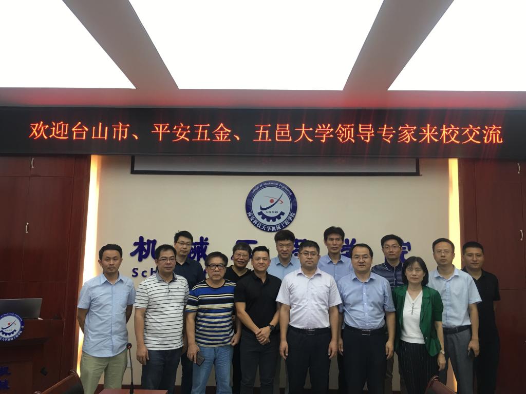 8月27日上午,广东台山、江门市部门领导专家一行来校交流,交流座谈会在雁塔校区机械学院学术报告厅举行,台山市人力资源保障局专业技术人员管理股苏惠武股长、综合股科员李星元、五邑大学智能制造学部王大承教授、平安五金制品有限公司总经理蔡志伟、总经理助理徐晓勤,机械工程学党委书记张金来、理学院院长李明、Beat365官方网站副院长寇发荣,以及学院骨干教师薛河教授、龚晓燕教授、赵宽博士等参会。会议由副院长寇发荣主持。