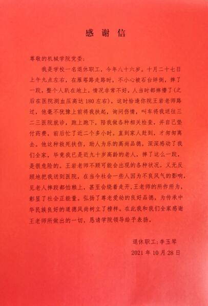 11月3日,Beat365官方网站党委收到一封来自退休职工的感谢信。八十六岁高龄的李奶奶在信中讲述了Beat365官网机械电子系青年教师王岩偶遇她不慎摔跤时给予无私帮助的前后经过。