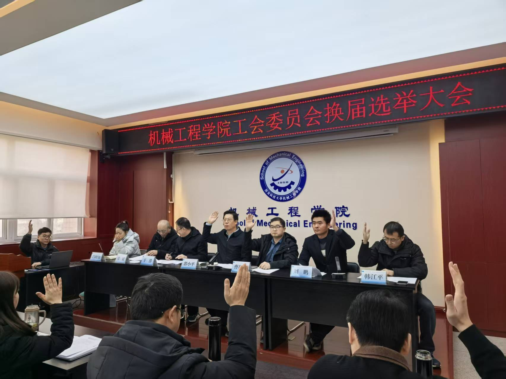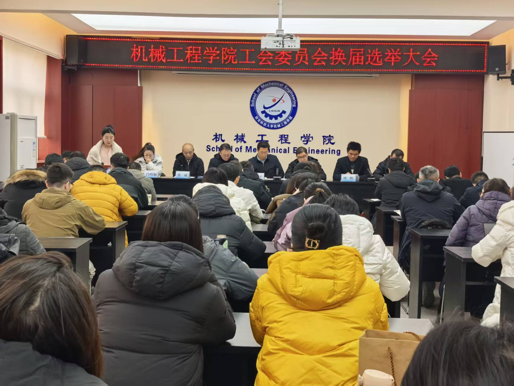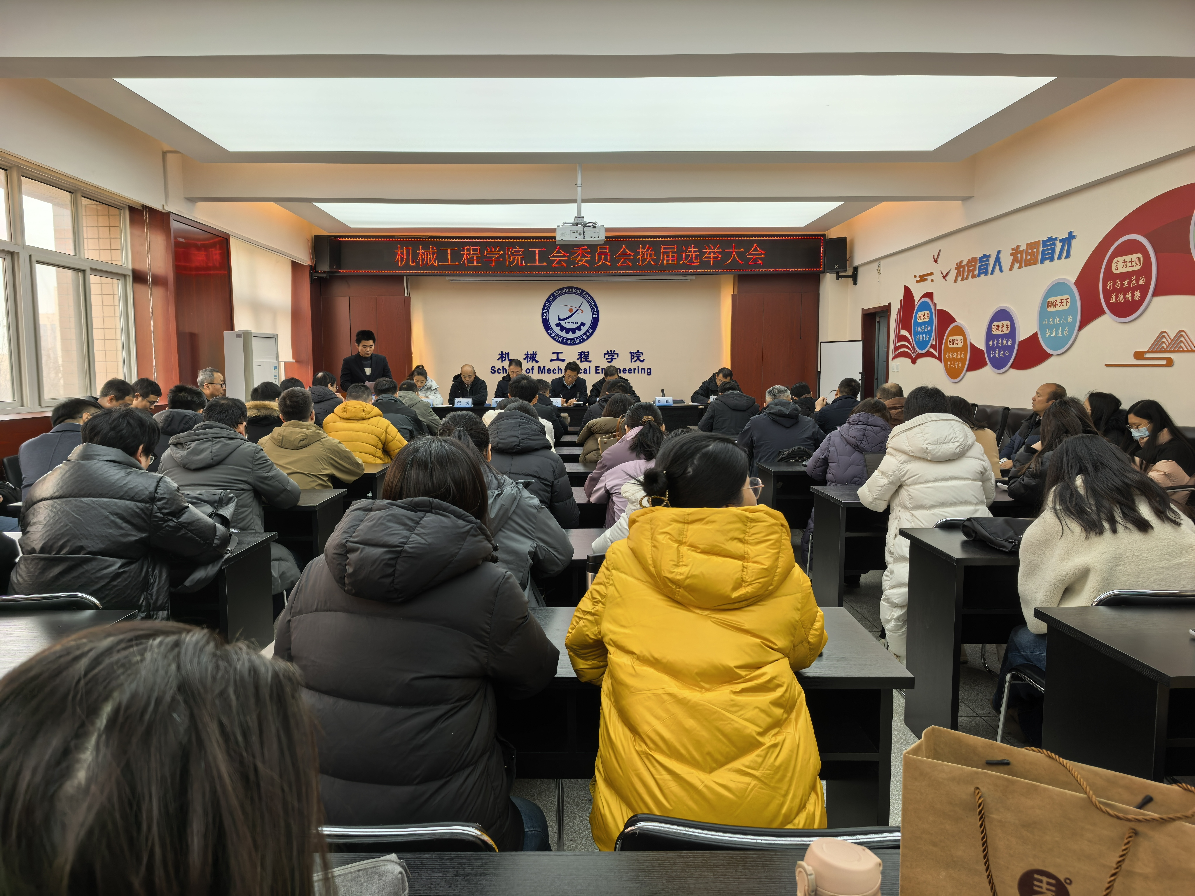 12月30日下午,机械工程学院在临潼校区320会议室召开学院工会会员大会,进行工会委员换届选举。学院党委书记郭小平,党委副书记、院长曹现刚,党委副书记、纪委书记尹弘,副院长赵栓峰、毛清华、钟斌,工会主席于洋、副主席刘鹏,工会委员张斌、吕叻加、韩江平,以及工会会员共计86人参加会议。会议由刘鹏主持。大会在庄严的国歌声中拉开帷幕。