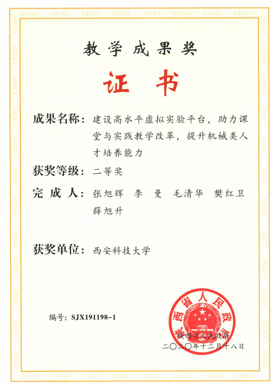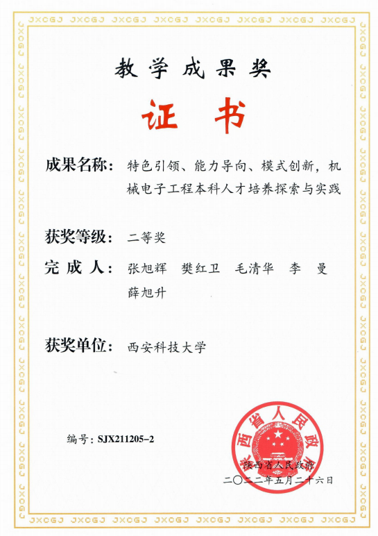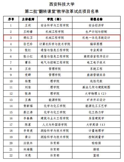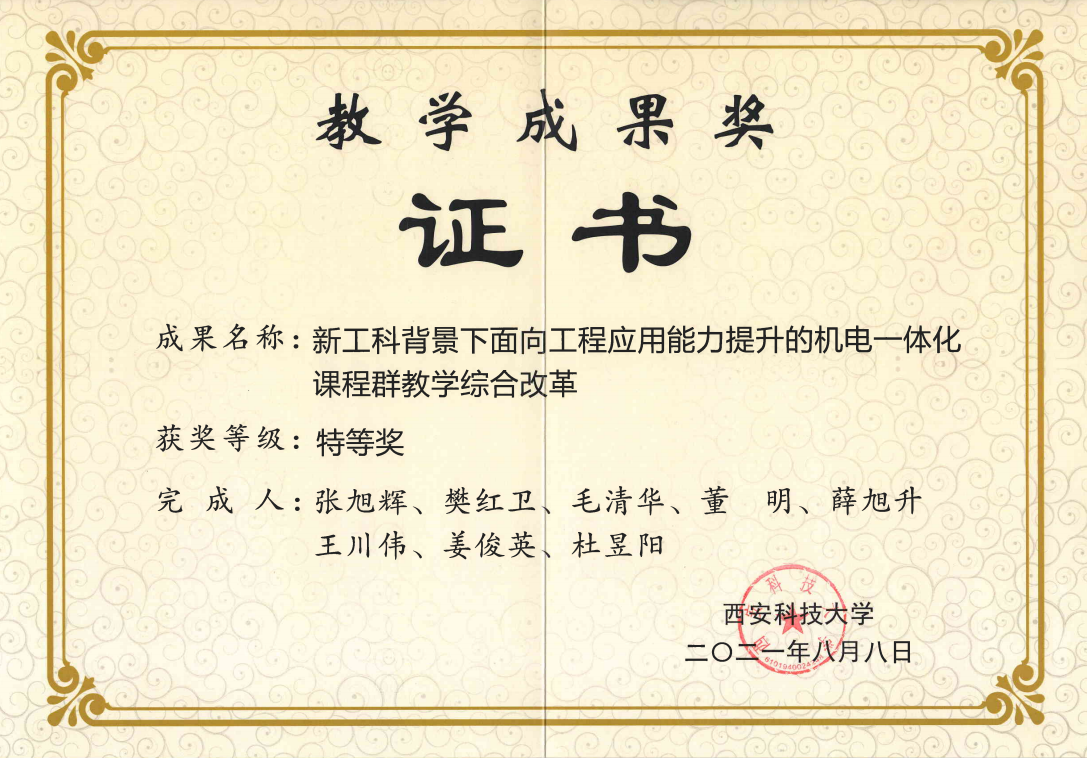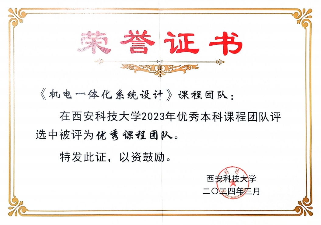 Beat365官方网站《机电一体化系统设计》课程组在张旭辉教授、樊红卫副教授带领下,坚持为党育人,为国育才,立德树人根本宗旨,从教材编写到课程建设,开展了全方位的教育教学改革,入选了陕西省一流课程,支撑了机械电子工程专业入选国家级一流专业建设点。主要建设成果如下: