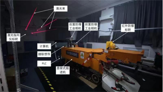 掘进装备定位与控制系统工作原理:利用前置防爆工业相机采集红外防爆标靶的图像,后置防爆相机采集激光指向仪的图像信息,将采集到的图像经以太网传输至防爆计算机中,在计算机中分别对红外LED特征图像和激光图像进行图像处理,获取标靶红外点特征和激光点线特征信息。通过构建测量系统全局坐标系,利用单目视觉测量原理,建立基于共面特征点的截割头位姿视觉测量模型和掘进机机身位姿视觉测量模型,结合所得图像特征解算掘进机截割头和机身在巷道坐标系下的位姿坐标。再融合捷联惯导和毫米波雷达数据等传感器信息最终得到悬臂式掘进机截割头、机身位姿以及掘进机状态信息。建立截割臂自动控制模型和定向掘进控制模型,以掘进机截割头和机身位置信息为反馈,与规划的路径或期望位置进行比较得到掘进机位置偏差,结合相应控制算法通过PLC控制向掘进机电液比例阀发送控制命令,控制掘进机的液压系统驱动掘进机截割臂和左右履带运动,实现掘进机自动控制。