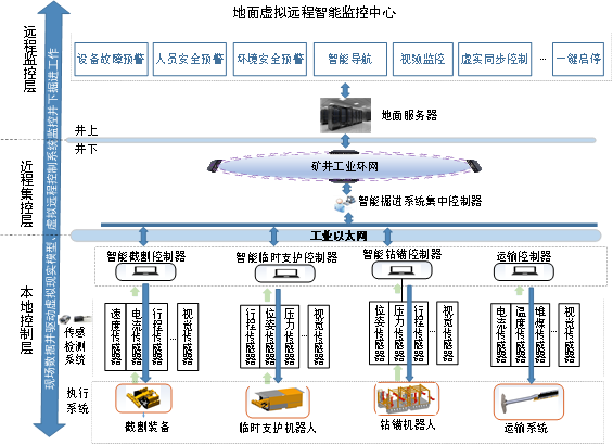摘要:煤矿巷道掘进受井下巷道特殊的非结构化环境及相对复杂工艺环节制约,“采掘失衡”现象突出,围绕“煤矿掘进设备长距离高精度定位”行业卡脖子问题,聚焦掘进设备长距离动态精确定位方法等研究,破解了恶劣环境下狭长空间的视觉精确定位难题,研发出一套煤矿掘进工作面智能操控系统,形成了井下巷道掘进装备精确定位、定向导航和定形截割技术。具体功能如下:①基于激光束合作标靶的掘进机机身位姿视觉测量;②掘进机定向导航与自主纠偏控制;③矩形、拱形等不同巷道截面自动成形控制;④人工示教成形轨迹智能生成;⑤视觉伺服记忆截割;⑥巷道截割轨迹实时显示、超挖欠挖报警和虚拟远程操控等功能。