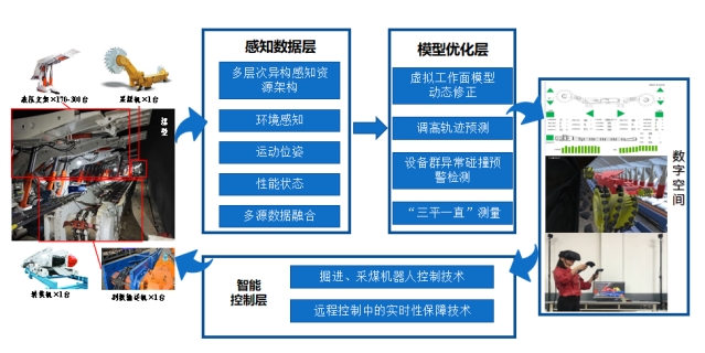 2014年以来,张旭辉教授聚焦巷道近程或地面远程智能掘进场景控制需求,带领团队不断探究智能掘进关键技术难题,为煤矿巷道掘进智能化相关理论与技术研究奠定了坚实基础,通过对煤矿智能化装备的创新研发,在煤矿采掘工作面智能截割技术、虚拟数字工作面构建及远程控制、智能采掘装备研发方面突破了多项关键核心技术,以“DT+VR” 远程决策、“视觉+”位姿测量、“人工示教”记忆截割,以及“虚拟设备”碰撞预警等四大核心技术,解决了智能决策、精确定位(定向导航和成形质量的基础)、轨迹规划和设备群碰撞预警难题。核心技术先后在陕煤小保当、榆林大海则、山西王家岭等煤矿井下掘进工作面进行了验证,为解决煤矿远程智能掘进提供了新的实现路径。为全面推进煤矿智能化发展积累了宝贵的经验,通过不断地进行理论、技术与装备创新,为推动我国煤炭工业快速发展提供有力支撑。