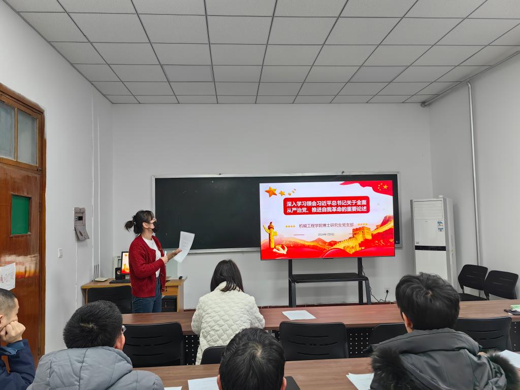 会上集中学习了习近平在二十届中央纪委二次全会上发表重要讲话等理论。支部书记传达了民主评议支部及党员的相关要求,并从支部基本情况、支部年度工作开展情况、存在的问题及下一步的工作思路及措施汇报了2023年度支部建设工作,支部党员结合个人思想、学习等情况深入刨析自身存在的问题并提出改进的方向。开展了支部党员批评和自我批评以及对支部及学生党员进行民主测评。本次民主评议的开展,进一步明确了支部和全体党员今后的努力方向,激励了全体党员充分发挥先锋模范作用,对全面提升党员自身能力水平、增强党组织的向心力、凝聚力和战斗力。大家在学习中踊跃发言,畅谈自己对党的创新理论的体会,一致表示要进一步发挥模范带头作用,以青年党员之力引领广大同学积极进步,勇担科技强国建设时代使命,为学校双一流建设贡献积极的力量。