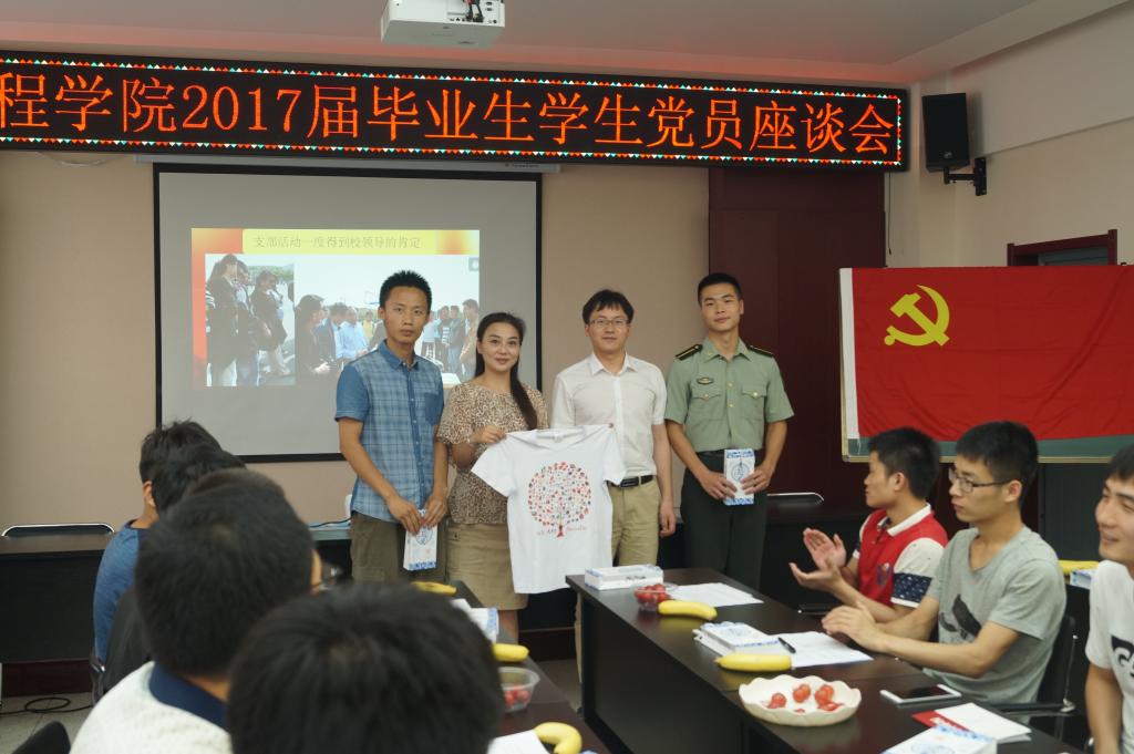 最后,李婉丽做会议总结,感谢同学们能够毫无保留地为母校的建设和发展建言献策,并对同学们提出了希望和要求。一是希望同学们牢记党员的责任和义务,做一名合格共产党员;二是不断坚持学习,争做优秀毕业生;三是珍惜校园生活,做文明离校表率,希望同学们毕业后继续关心和支持母校的建设和发展。毕业生代表向学院赠送了班级毕业T恤以及年级合影,为本次座谈会画上圆满的句号。