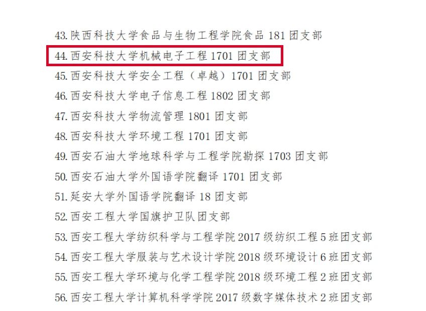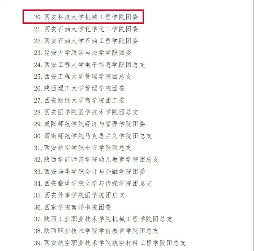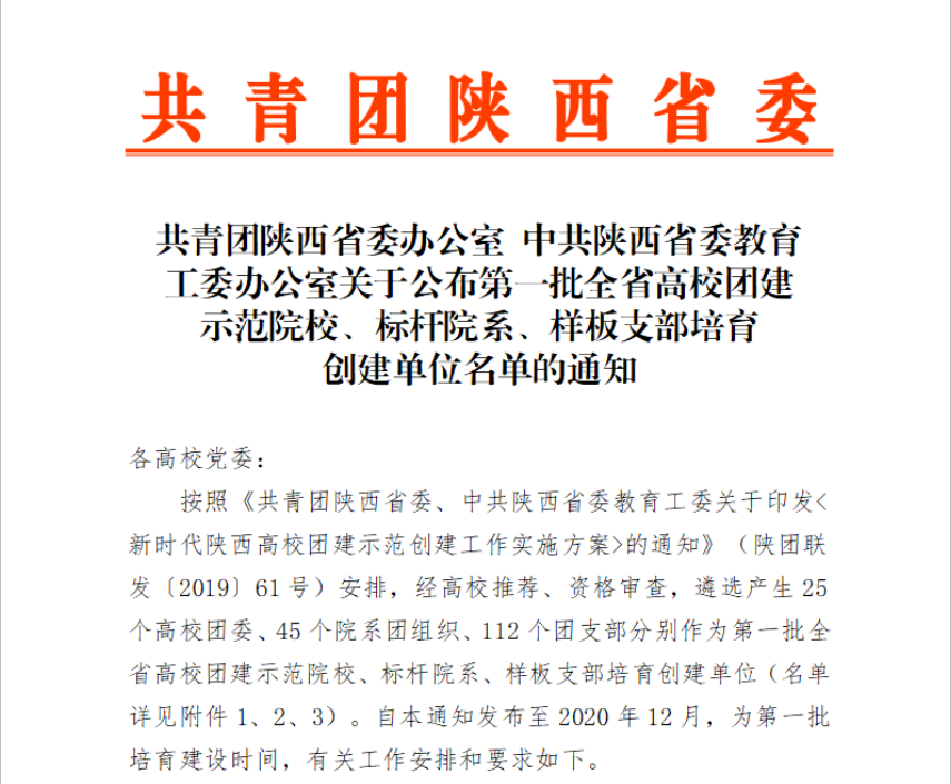2020年5月13日,由共青团陕西省委办公室,中共陕西省委教育工委办公室公布的关于第一批全省高校团建示范院校,标杆院系,样板支部培育创建名单中,Beat365官方网站团委被评为“全省高校团建标杆院系”。
