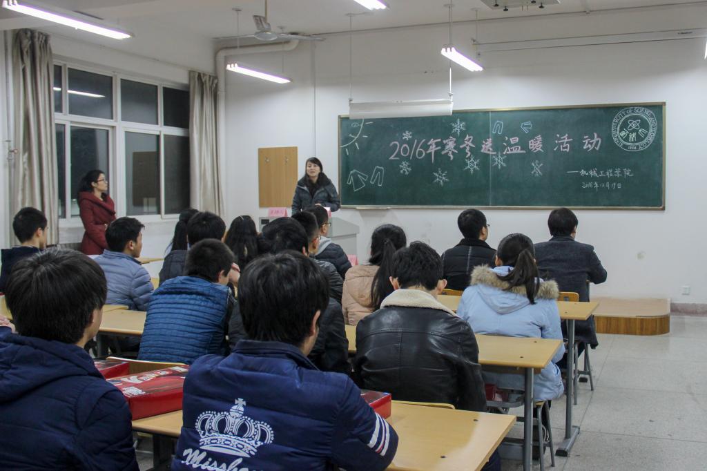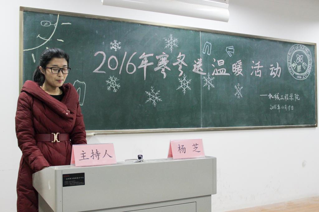 年年寒冬送关爱,情暖学子创和谐。随着天气逐渐转寒,为切实解决学生的御寒问题,12月19日晚18点机械学院在十教501教室举办了寒冬送温暖活动。本次活动由2016级辅导员杨芝老师主持,机械学院党委副书记李婉丽老师,机械学院全体辅导员老师以及获得寒冬送温暖资助的全体学生参加。
