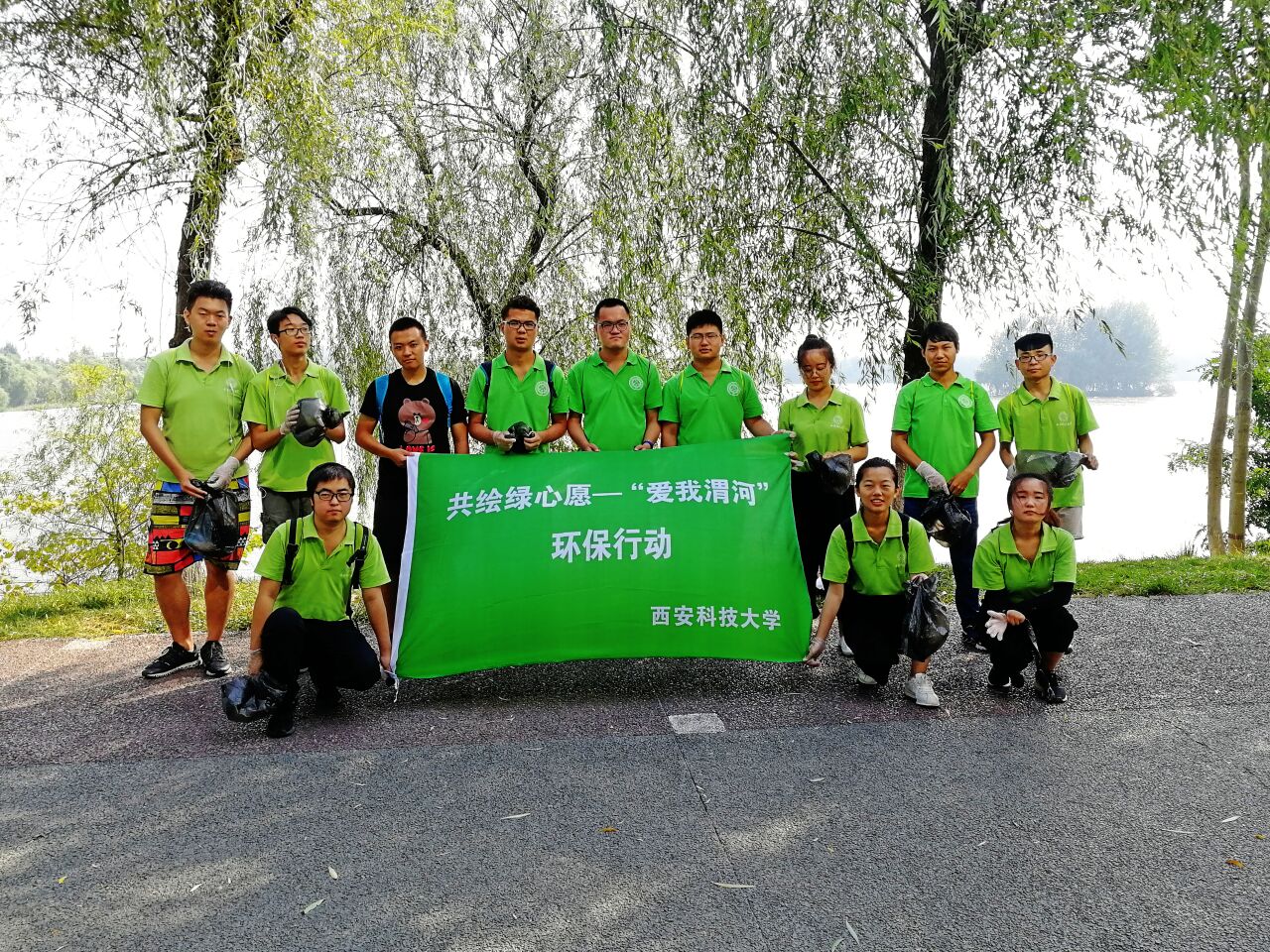 早上环保志愿者们在团队老师李帅田的带领下来到了湿地公园,由于此处为公园,所产生的垃圾大多是公众不经意间落下的塑料水瓶或者纸巾。实践队员人手一个黑色塑料袋,带着专业捡垃圾手套,沿着灞河旁边的小路,队员通过自己的寻找,找到了许多被遗弃的垃圾。还通过一条小路下到了灞河边上,打捞了些许沿水漂流的垃圾。保护了水质的清洁。