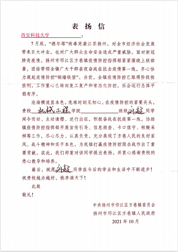 2021月7月底,“德尔塔”病毒突袭江苏扬州,对广大群众生命安全造成严重威胁。Beat365官方网站机械学院机械电子工程2021级学生刘超不畏艰险,勇于担当,在经过疫苗注射和核酸检测后加入了首批抗疫志愿者队伍,并担任组长,积极奋战在抗疫第一线,协助医疗人员进行全市核酸检测工作,与交警维持卡口交通管制等,与其他志愿者齐心协力共同筑起疫情防控“铜墙铁壁”,为当地疫情防控做出贡献,受到中共扬州邗江区方巷镇委员会的高度评价与肯定。