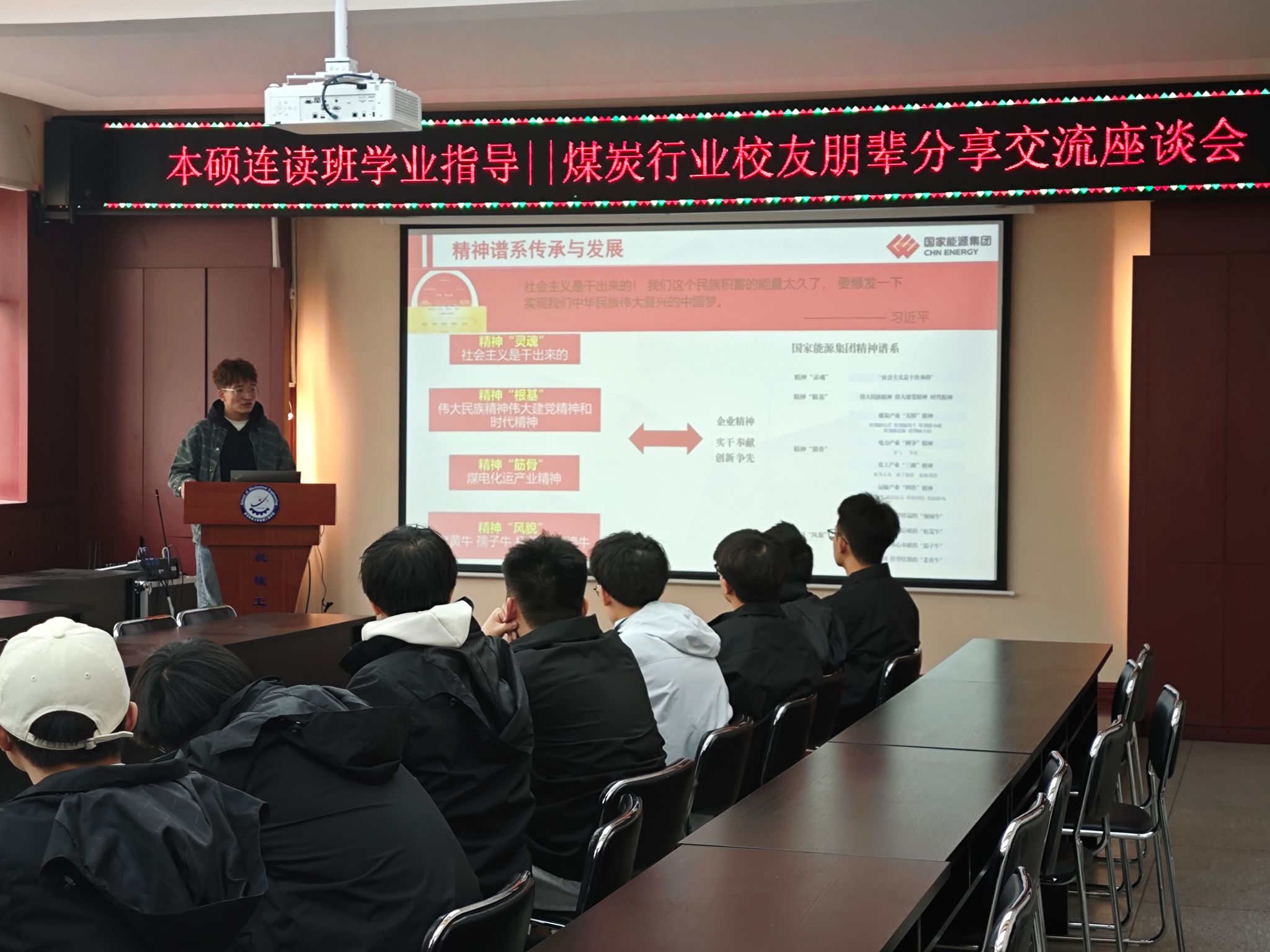 张威泽现就职于国能神东煤炭集团有限责任公司大柳塔煤矿。座谈会上,张威泽向同学们介绍了国能神东煤炭集团有限责任公司大柳塔煤矿的发展建设、企业文化、煤矿生产系统、煤矿智能化建设情况,帮助同学们进一步了解煤炭智能化发展;重点围绕实干、奉献、创新、争先的企业精神对自身职业发展的积极影响;同时结合个人学生时代的学习规划、学习经历、科创竞赛实践经历以及入职后的工作体会,强调了《大学物理》《电工电子技术》等专业学习、具备扎实的制图能力以及软硬件操作技能对于提升机械学科学生职业素质能力提升的重要意义,他勉励学弟学妹坚定成才自信,积极创新,刻苦学习、在本科期间夯实专业基础,积极参加学科科技竞赛,练就真才实学,立志为行业发展、强国建设贡献青春力量。