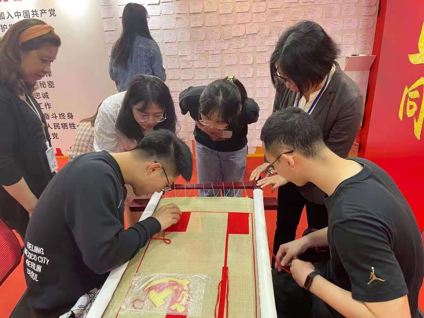 党支部书记周青利老师手把手教学,一个同学绣完,指导下一个同学,百年芳华,一针一线,传承不绝。一根根“红线”串起了他们爱党爱国之心,坚定感党恩、听党话、跟党走的信念,同学们亲手制作党徽,以针代笔,以线润色。