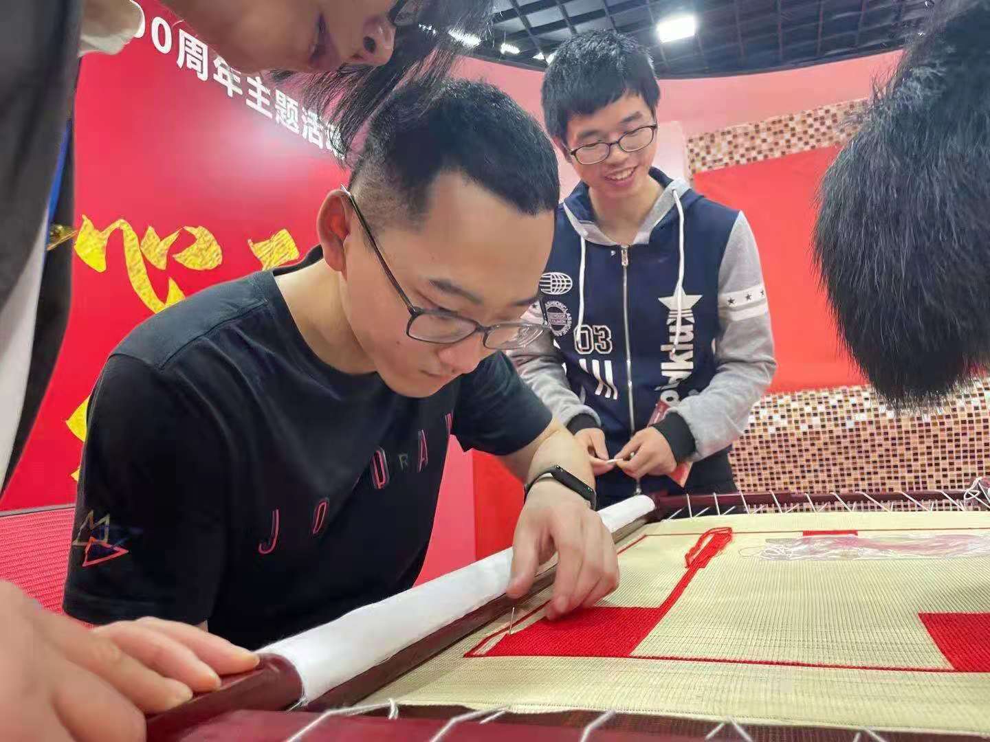 金线飞舞,红旗飘扬。手中的绣线集结起来,就像团结在一起的力量,紧密且结实。同学们通过绣党旗,重温百年来党领导人民走过的光辉历程和伟大成就。大家在一针一线中绣出了奋勇争先的决心、融入了对党的热爱、忠诚与敬意!