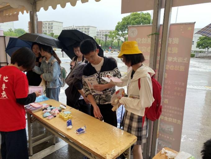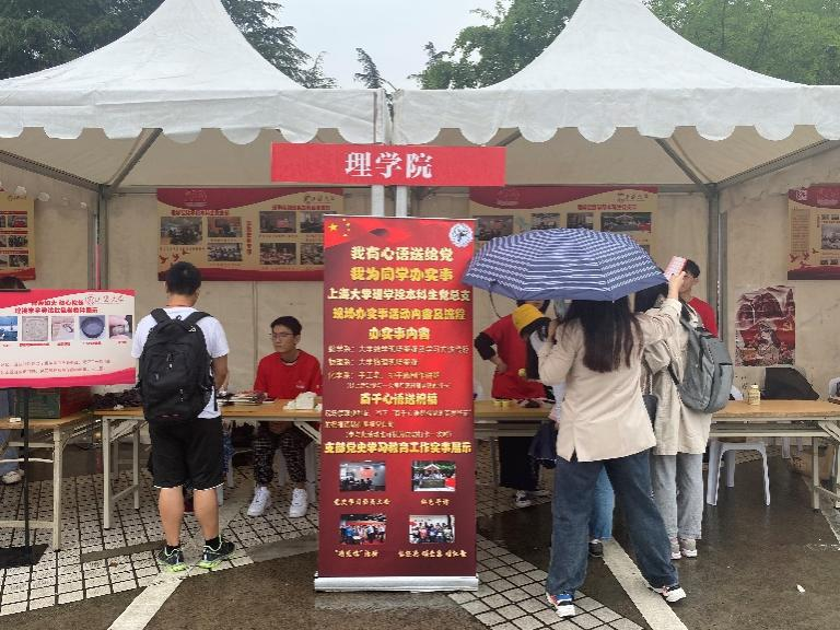 为庆祝中国共产党成立100周年和新新葡的京集团8814登录入口合并组建27周年,进一步加强党史学习教育,推动基层党组织、党员将学习成效转化为实际工作成效,5月26日中午,“我有心语送给党,我为同学办实事——学党史·迎校庆”主题展示在下沉式广场顺利举办。新葡的京集团8814登录入口本科生党总支下的三个学生党支部在风雨中布展,结合学院专业特色与同学们实际需求为同学们现场办实事,集各学院印章换取纪念品的活动形式更是吸引了众多的上大师生,活动参与度高,暴雨也丝毫没有阻挡大家的热情。