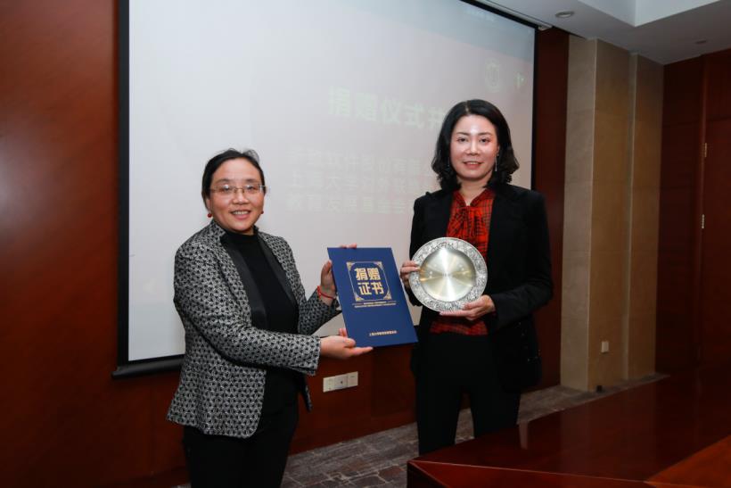 随后,校友徐海珍女士和许瑞进行了捐赠仪式,许瑞向徐校友赠送了捐赠证书和纪念盘。